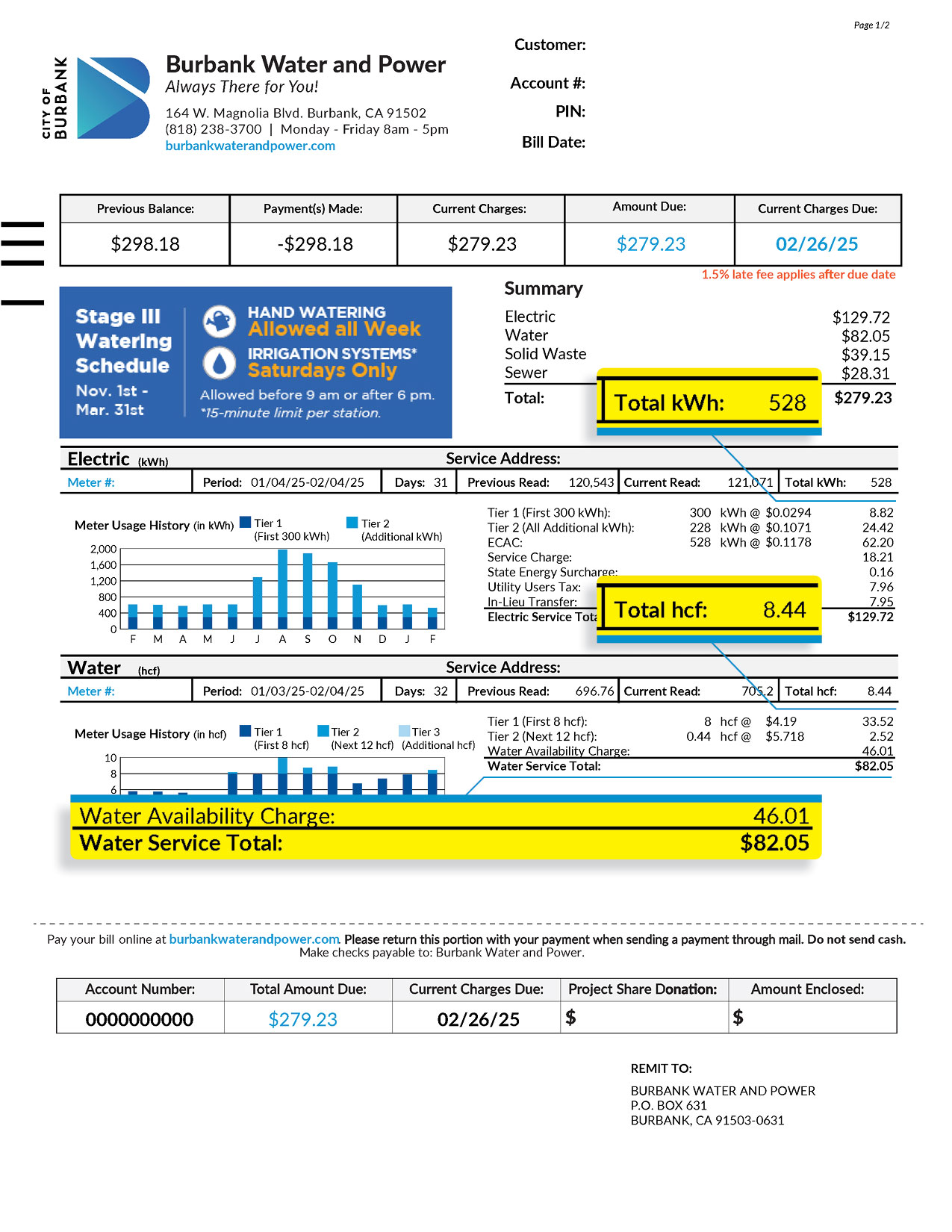 The electric and water Bill Calculator is designed for a typical residential utility account bill in Burbank. The rates shown are for standard electric and water services. Rates will vary for customers receiving financial assistance. If you have questions, please contact BWP or call us at (818) 238-3700.