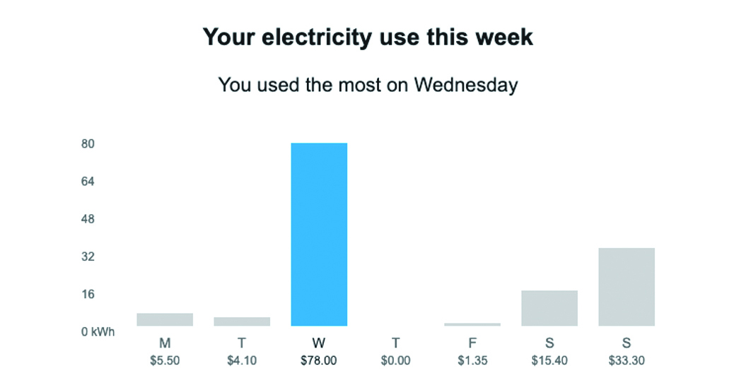 The Weekly Energy Updates (WEU) features your electricity usage information, and will include charts on: